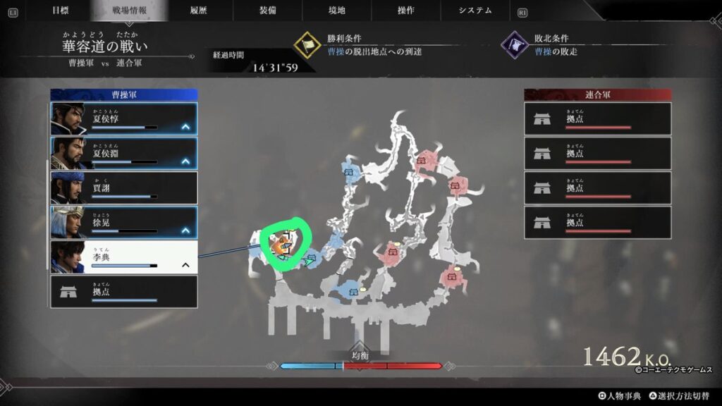 ただ、中央側を経由して肉まんを補充したりしながら再占拠を行い、その後に西側の道を通って曹操の元に戻るくらいの時間なら、その間は味方側の武将が倒されることはなかった。